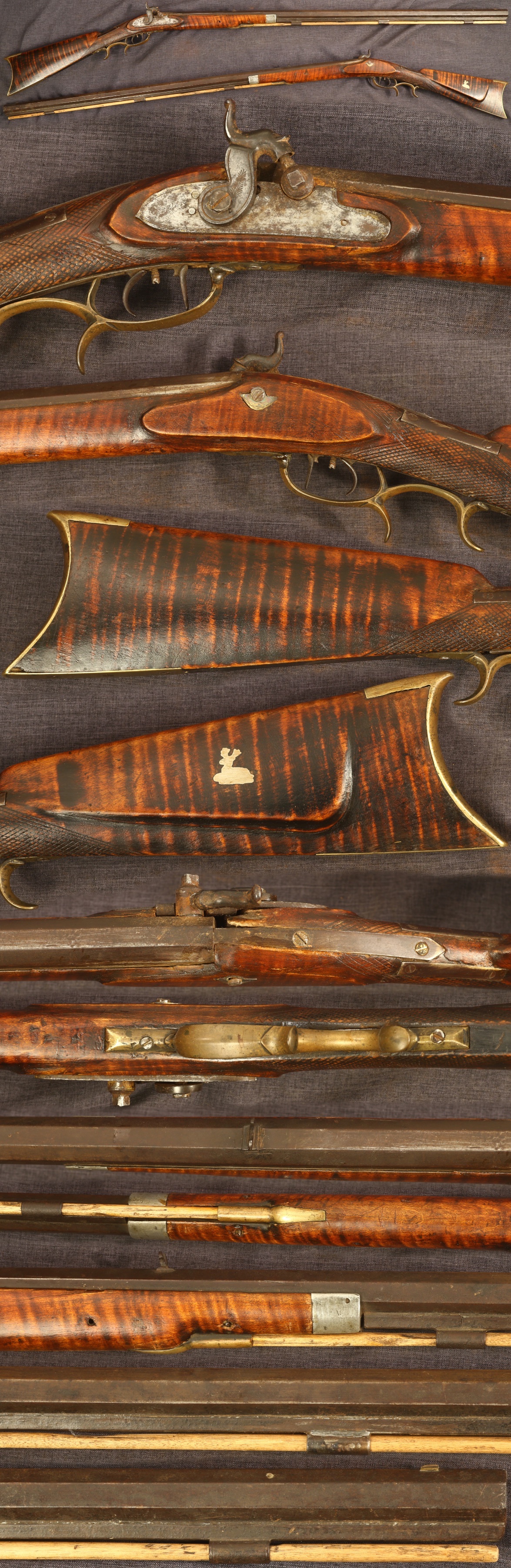C1860 curly maple halfstock percussion muzzleloading rifle. 37" octagon barrel of about .42 caliber bore and 1" width. No markings apparent. Nice antique open sights. Barrel has dark patina, other metal parts may have been cleaned at some point. Stock has nicely striped grain, resting deer inlay in cheekpiece, has a break in the wrist well repaired long ago with two iron straps. Wood has a crack at the forearm tip on left side and in front of the lock, has thin pieces of replaced wood around the lock mortise and opposite the lock. Mechanically functional with set triggers, sold as a collector item only, not warranted safe to shoot.