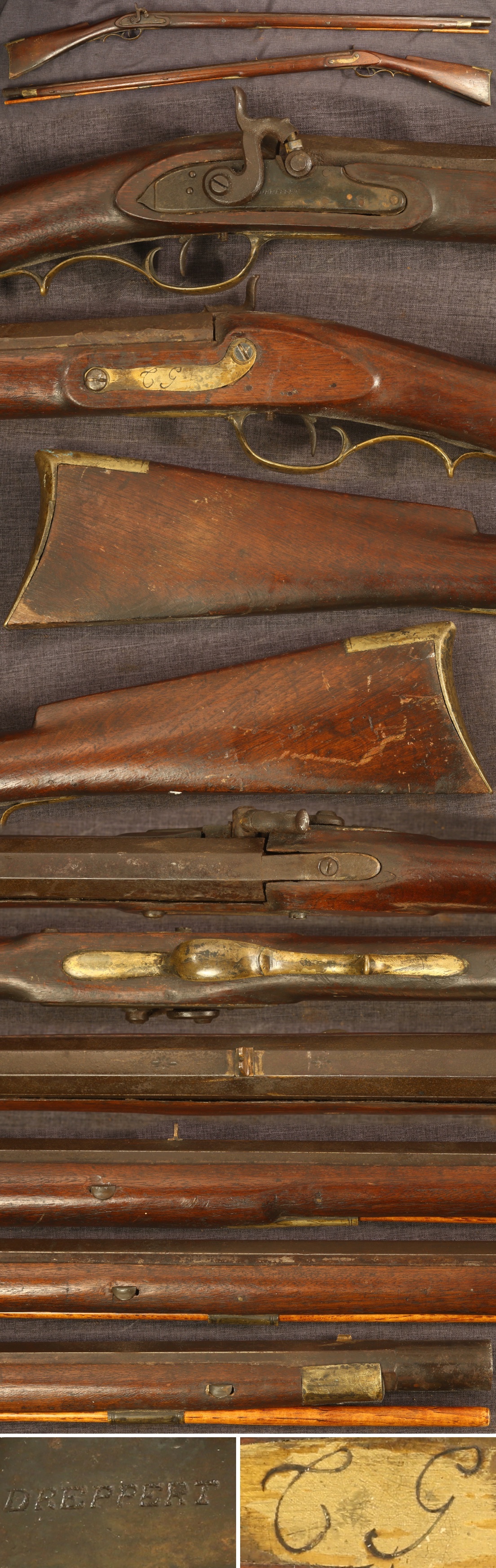 Scarce Pennsylvania militia smooth rifle by Christian Gumpf of Lancaster, PA. Christian is the son of Johan Christopher Gumpf also of Lancaster, both are listed as having produced Kentucky rifles and military rifles. Signed on sideplate "CG" in distinctive script also seen on rifles signed with the full Gumpf last name. "DREPPERT" marked lock also seen in Gumpf rifles, most likely a member of the Dreppard or Drepperd family, who also operated in Lancaster in firearms operations. 38-1/8" octagon barrel of about 0.63" smooth bore, 2" of muzzle turned round to 1-1/8" width in order to accept a bayonet for militia service. Metal parts are in an uncleaned patina state with some expected pitting in the barrel breech area. Straight-grained walnut fullstock is good with an older varnished finish showing scattered marks from handling and a couple minor slivers along the forearm edge. Lock is mechanically functional aside from the trigger being able to release the hammer from half cock. Sold as a collector item only, not warranted safe to shoot.