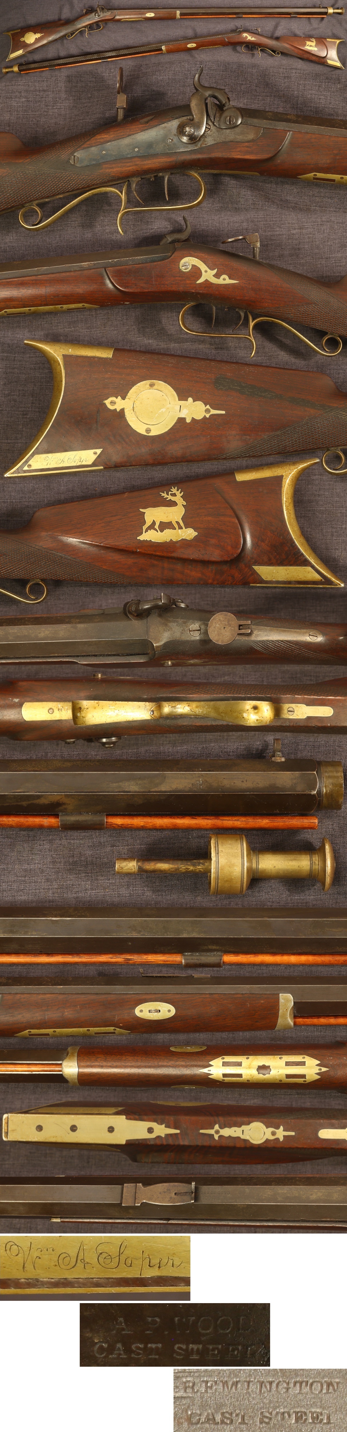 C1850-80 fine Delaware County, New York target rifle by Amos P Wood of North Hamden. Sellers' "American Gunsmiths" lists him as having operated 1850-1882. Hamden remains a small town in the Catskill Mountain region outside the state park area. A claim to fame of the town is the first known mention in a newspaper of baseball in 1825, referenced as "bass-ball". Marked on top of barrel "A.P.WOOD/CAST STEEL", on flat of barrel in front of bolster hidden by stock "REMINGTON/CAST STEEL", with owner's nameplate in lower right side of butt engraved "Wm.A.Soper". 35-1/4" octagon barrel with turned muzzle and original brass bullet starter. Bore is 0.36" and octagon portion of barrel is 1-3/16" width. Nice original sights including flip-up circular front sight, adjustable open rear sight on barrel (elevator missing), and folding "lollipop" tang sight. Nice german silver furnishings. Iron parts have a dark patina and are virtually free of pitting. Circular box in right side of butt contains two period conical lead bullets which fit the bore. Walnut halfstock is fine with some attractive grain in the butt, shows light wear and use with minor handling marks, one moderate mark above the lock, one small chip above the lock, and a couple minuscule grain cracks to the wood less than 1/2". This is a nicely built rifle that was clearly cared for over the years. Mechanically good including double set triggers, sold as a collector item only, not warranted safe to shoot.