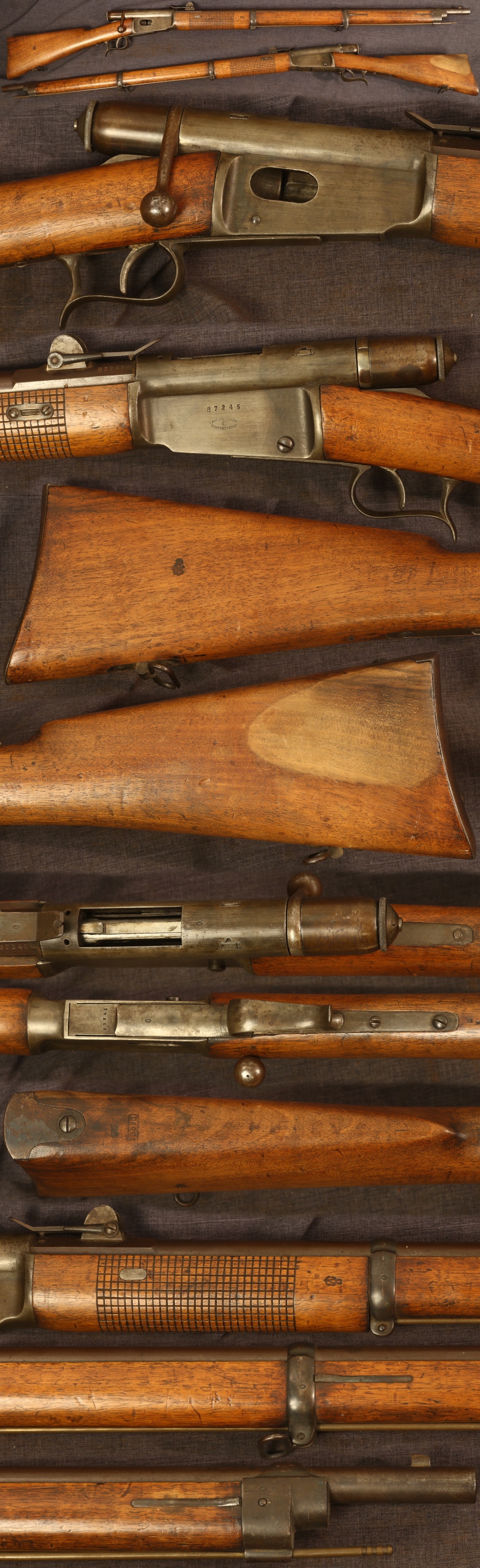 SOLD - Swiss M1871 Vetterli rifle. Serial number 87245. Metal parts have an even medium patina overall. Stock is nicely cartouche, free of cracks, showing scattered minor handling marks and a stain on the left side of the butt. Cleaning rod is a replacement. Mechanically good, sold as a collector item only, not warranted safe to shoot.