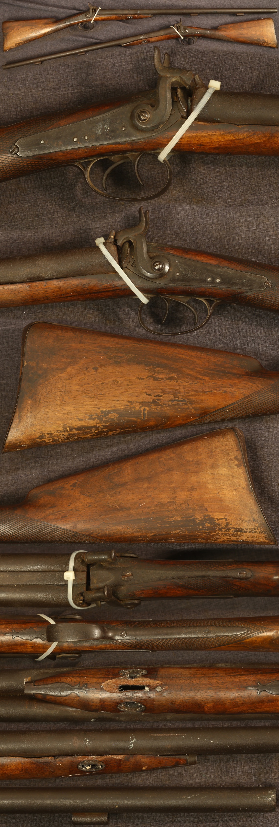 MANTON, as marked on locks, percussion double barrel wallhanger for display. Each barrel has a small hole underneath the fore stock drilled through to the bore. 30" barrels. Metal parts are lightly engraved with a dark patina overall and some pitting present. Stock is checkered in the wrist, with the forearm missing a large chip where the barrel key would have been, which is absent, along with the escutcheons and the barrel lug. Has some additional chips to the right side of the forearm edge. Ramrod is absent. Locks function mechanically. Not warranted safe to shoot.