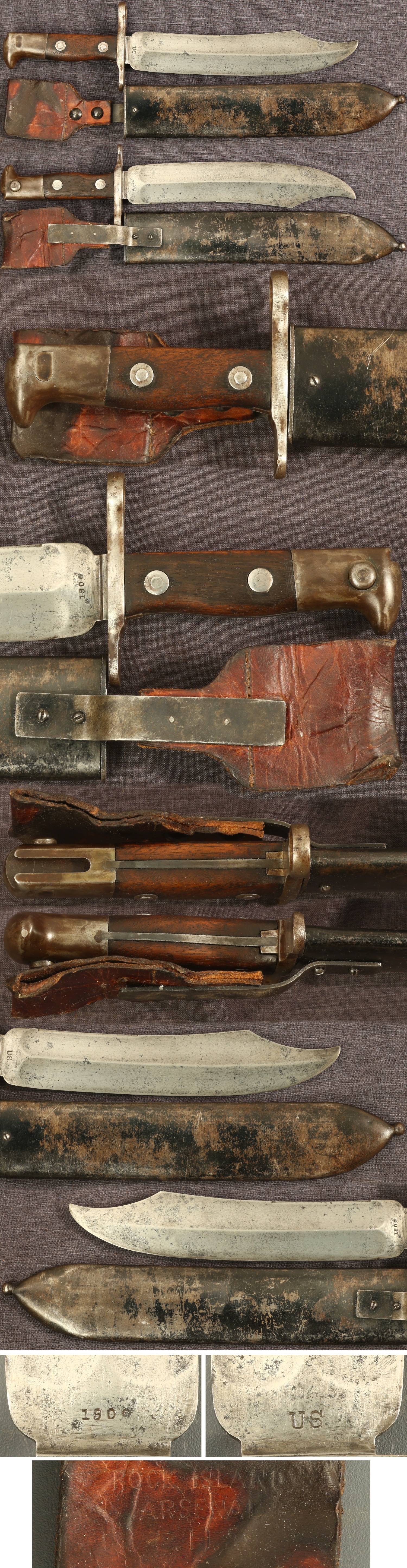 | rare Krag bowie bayonet with scabbard, dated 1900, scabbard has interesting experimental belt hanger marked "ROCK ISLAND ARSENAL" | Good | $1750.00 |