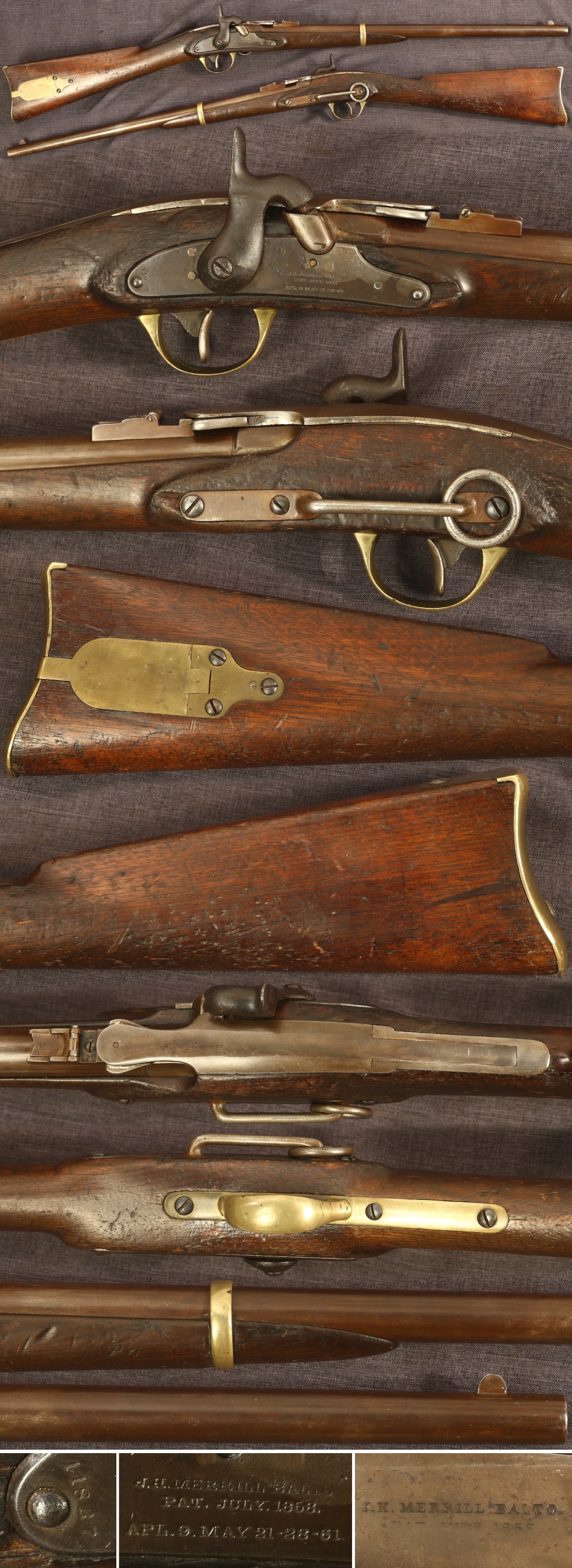 First type J.H.Merrill percussion breechloading carbine. Serial number 11827 on lock. Metal parts appear to have been cleaned at some point with a lighter coloration to the brass and a darker coloration to the iron. Stock is battered from saddle wear with a couple chips in the lock mortise and in front of ring bar. There is still a vestige of a cartouche in a protected spot by the ring bar. Mechanically good, sold as a collector item only, not warranted safe to shoot.