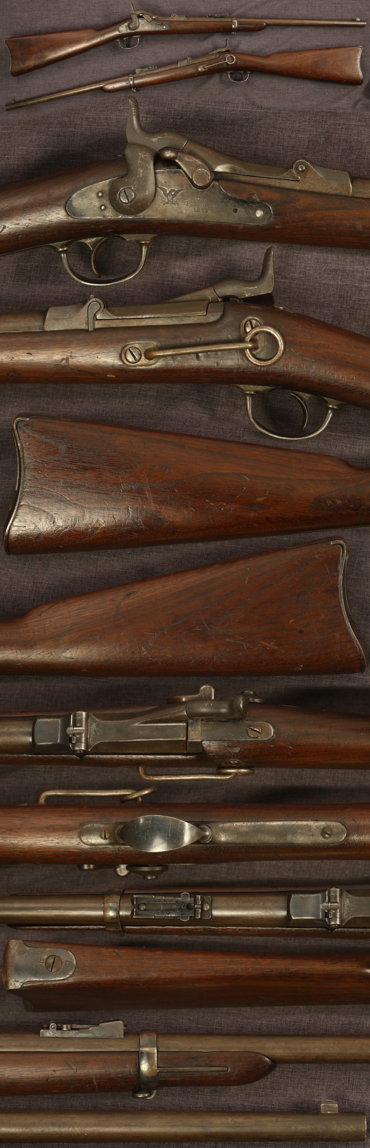 Springfield early M1873 .45-70 trapdoor carbine. Serial number not visible. Has many early features of band with stacking swivel, early sight with "slotless" screws, "high arch" breechblock with early marking, dated lock with coarsely knurled hammer, and smooth trigger. Has upgraded buttstock with trap in buttplate for maintenance components. Metal parts have a pleasing medium patina with some original blue finish present. Stock is good, showing minor handling marks from use, free of cracks, showing average wear. Mechanically good, sold as a collector item only, not warranted safe to shoot.