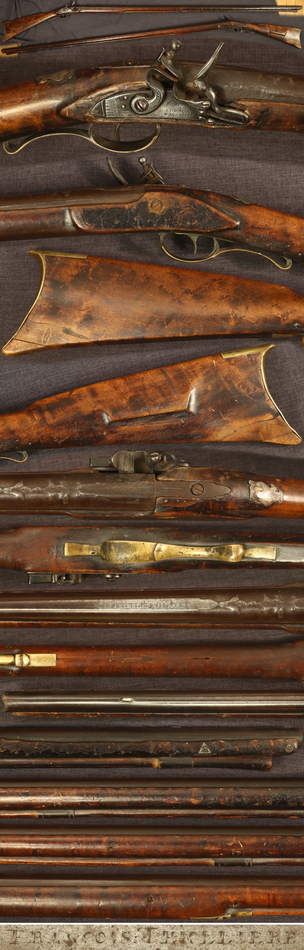 C1820-40 flintlock maple fullstock Pennsylvania longfowler made with C1700 French barrel, which appears to be signed "FRANCOIS THIGLLIERE" forward of the ornamented breech. 55-3/4" barrel with blade front sight set back from muzzle, about 0.65" bore. Appears to be a reconversion to flintlock. Fancy silver wrist escutcheon that may have come from the same early firearm as the barrel. Metal parts have a medium to dark patina overall with some pitting in the barrel breech. Maple fullstock has some birdseye character in the butt and striped character in the forestock. There are two replaced pieces of wood in the toe of the butt, some chipping to the lock mortise, chipping to the forearm edges, more handling marks further down the forearm with some absent slivers and cracking toward the tip, which has two small folk art geometric inlays that appear to be intended to close a crack. 50-3/4" ramrod may be a little short for the gun, but has pronounced shadows from having been in the gun for many years. Mechanically good, sold as a collector item only, not warranted safe to shoot.