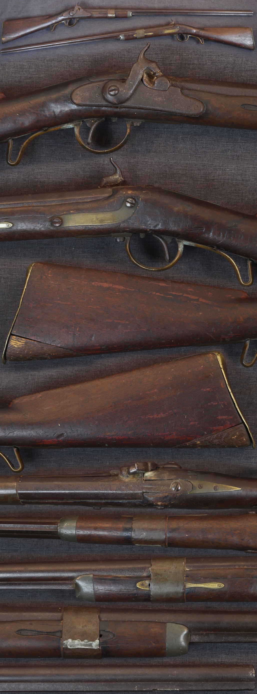 C1860 single barrel percussion fowler made with Austrian musket parts. Austrian eagle visible on rear of lock, 34-3/8" long barrel of about .57 caliber bore that appears to be Austrian, as is the brass triggerguard. Trade sporting buttplate, poured pewter forearm cap, soldered iron barrel band, and fish-shaped engraved inlay in left side of forearm, right side missing. Iron under rib on barrel with missing ramrod pipes. Metal parts have medium to dark patina overall with some light pitting on the barrel and lock. Stock may be Austrian issue, altered to half stock, showing moderate to extensive use with numerous handling marks, several light cracks in the forearm, and a piece of wood replaced in the butt toe. Lock does not have half cock, but cocks fully. Sold as a collector item only, not warranted safe to shoot.