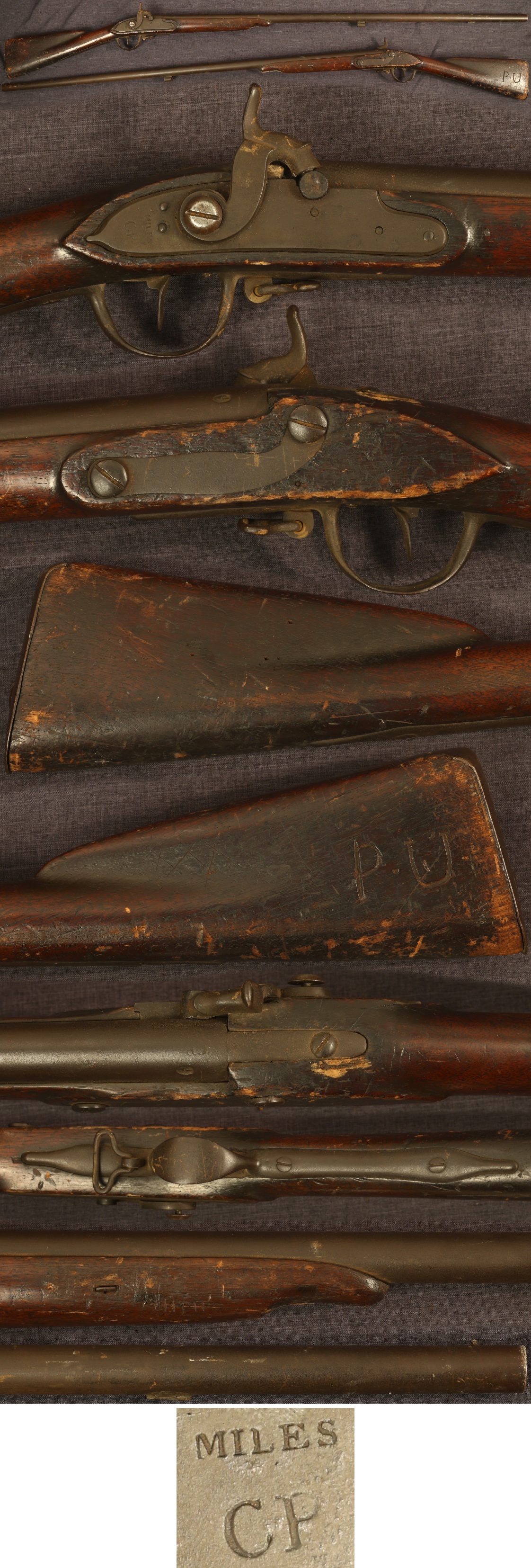 M1797 Commonwealth of Pennsylvania percussion conversion musket by John Miles. Nicely marked "MILES/CP" at rear of lock and proofed with "CP" mark at barrel breech, additionally proofed in stock opposite lock. 41" round barrel with bead front sight. Metal parts have an untouched chocolate patina overall with some minimal pitting in the barrel breech. Ramrod is absent. Stock is shortened to the area of where the lower barrel band was, wood overall has an old added finish with handling abrasions from over the years, scattered marks from handling, old chip to rear of lock mortise, period initials "P.U" in left side of butt, and lightly scratched "XXX" in left buttstock comb. Mechanically good, sold as a collector item only, not warranted safe to shoot.