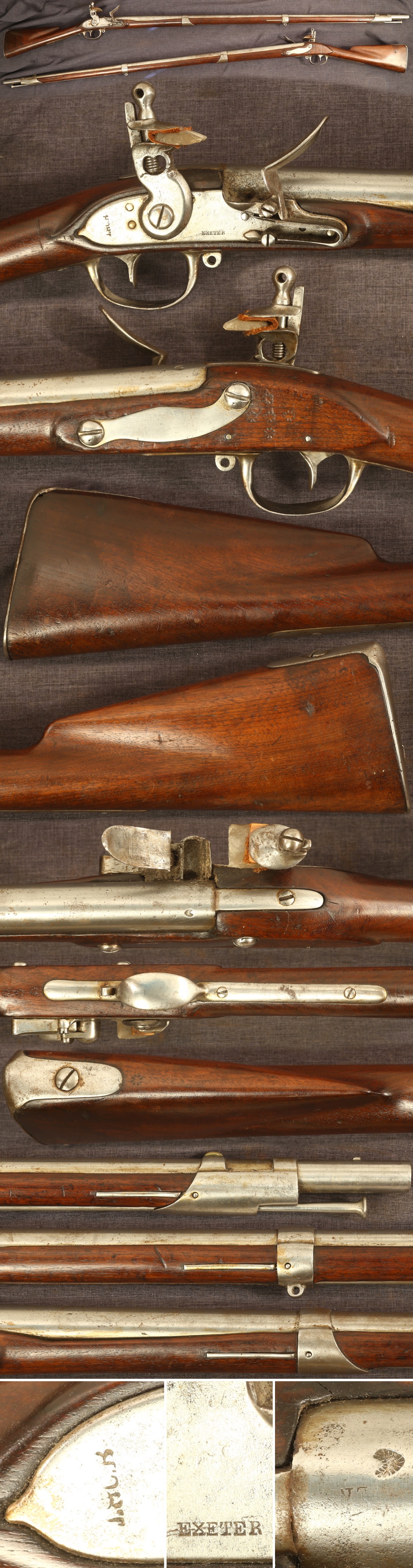 M1808 flintlock contract musket by Joshua & Charles Barstow of Exeter, New Hampshire. Only a contract of 2500 was in place with 2375 believed to have been delivered, making them one of the most reliable of the contractors, who often struggled to deliver a quality product while remaining financially solvent. 44-1/2" barrel. Marked at rear of lock "J.&.C.B" and "EXETER" in front of hammer with an apparent shadow of a script "US" and eagle. Marked on barrel with a heart-shaped proof and an unreadable inspector initials. Metal parts are cleaned with a light salt-and-pepper coloration and some expected pitting in the barrel breech. Sling swivels are absent. Stock shows cleaning, has some interesting small starburst impressions in various places around the stock, an old sliver is missing from the forearm edge in front of the lock, and a small crack by the rear lock screw. Ramrod is a reproduction and is broken off between the lower and middle bands. Mechanically good, sold as a collector item only, not warranted safe to shoot.