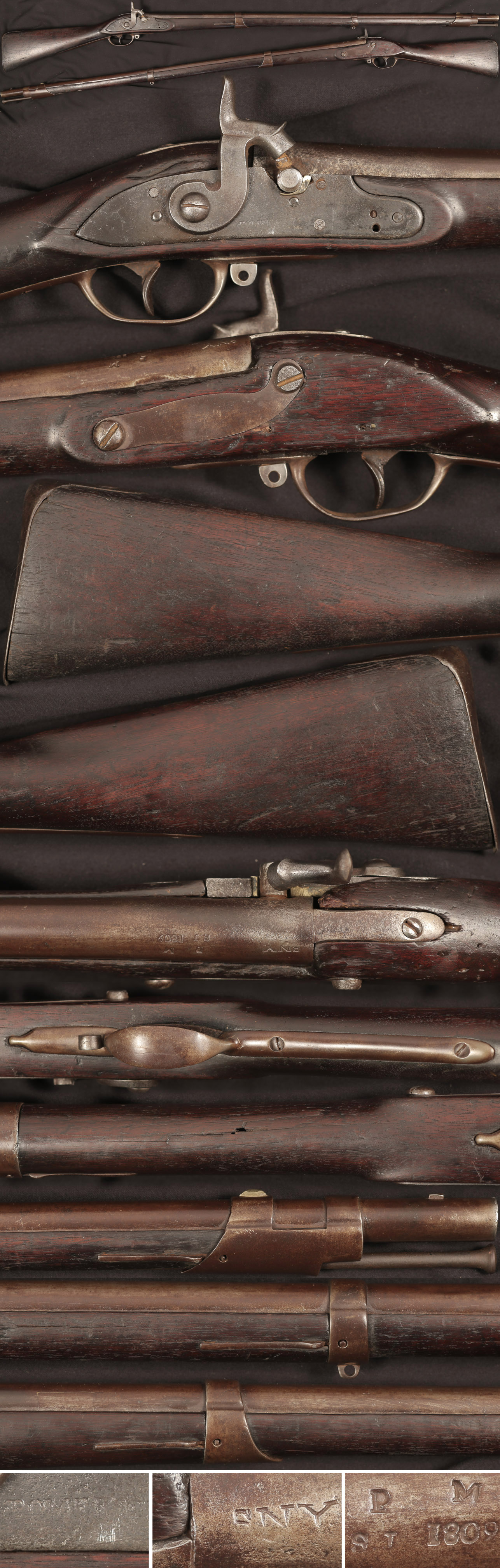 M1808 L. Pomeroy State of New York musket. 40-11/16" barrel appears to be original length. Marked on lock "L.POMEROY" somewhat faintly. Barrel is marked "SNY" for New York and dated 1809. Metal parts are generally a pleasing brown patina with some pitting in the barrel breech area. Stock is good, has some minor chipping in the ramrod channel edges, and some slivering in the forearm edges, a forearm grain crack on the right side between the bands, and a couple cracks in the bottom of the forearm where it became thin through to the ramrod channel from use. There is some minor age checking in the stock by the buttplate. Sling swivels are absent. Overall, an honestly used gun with a good appearance. Lock does not appear to have half cock. Sold as a collector item only, not warranted safe to shoot.