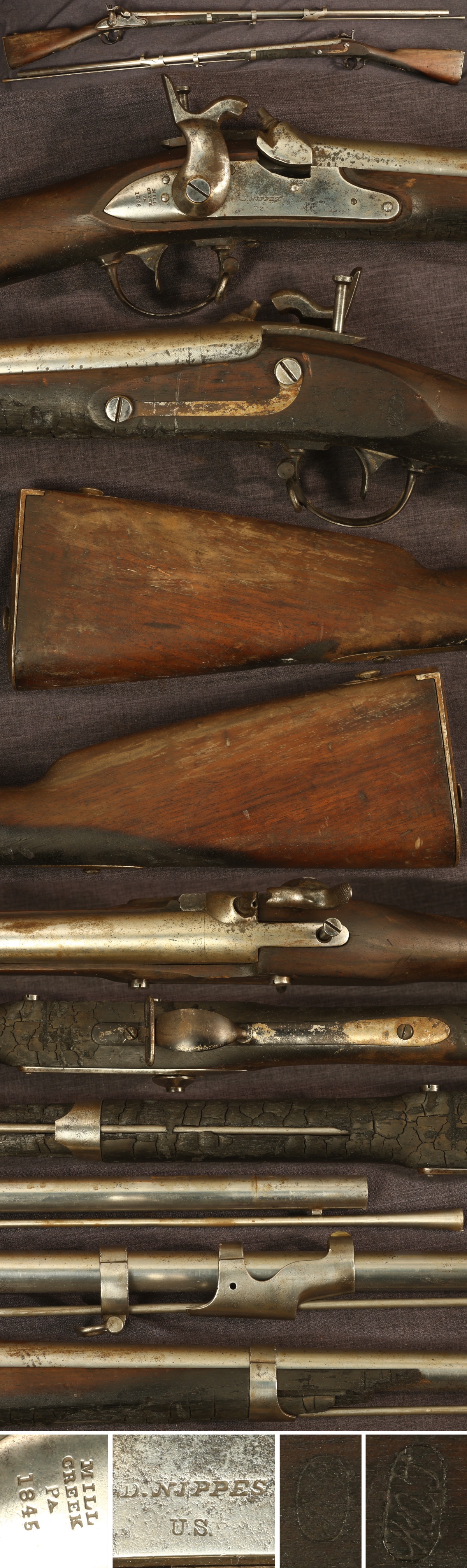 M1835 D.Nippes, Mill Creek, PA US contract percussion conversion musket. Dated 1845 on lock. Fine metal parts with much bright appearance and some scattered pitting. Stock is charred from having been damaged in a fire, still shows good cartouches, but parts need some adjustment to fit. Replacement ramrod won't go all the way in. Mechanically good, sold as a collector item only, not warranted safe to shoot.