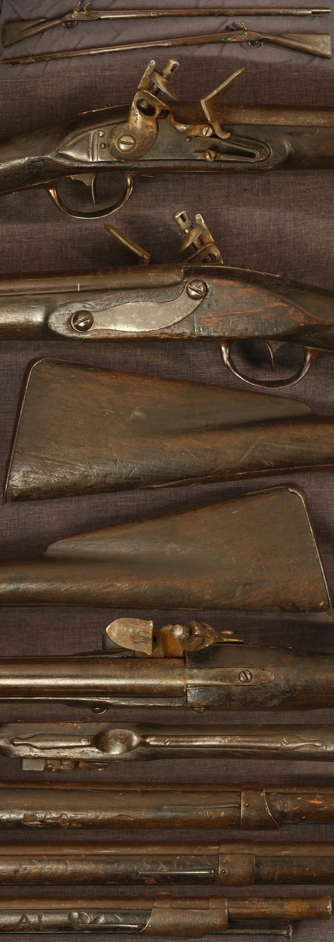C1750-70 French style flintlock fusil musket. 42" round barrel. Overall lighter weight than the typical musket of the period. A reconversion to flintlock. Metal parts have a dark patina overall with scattered dings and pitting. Stock is good, showing numerous minor to moderate handling marks and a small crack by the rear lock bolt. Has name/initials "AL" neatly placed behind upper barrel band. Mechanically good, sold as a collector item only, not warranted safe to shoot.