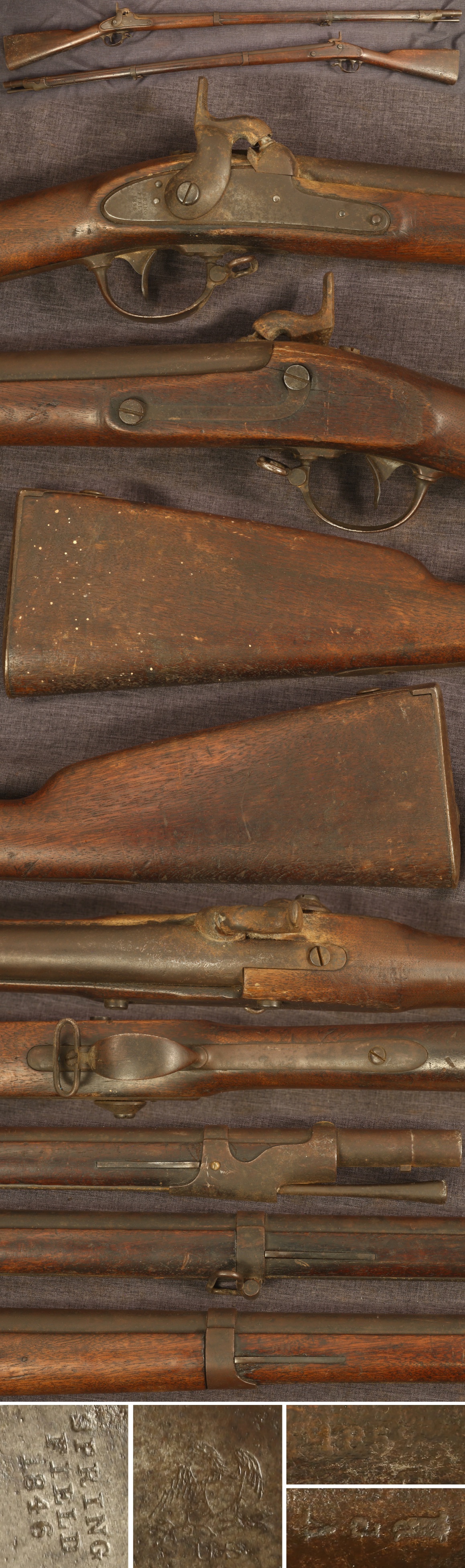 Springfield M1842 musket, dated 1846 on lock. Visible barrel proofs with date of 1852 on tang. Original length barrel and 41-1/2" original rod with threads removed. Metal parts are untouched overall with some expected pitting in the barrel breech area. Stock shows average wear and use overall with good patina, has scattered overall marks and scratches from handling, some of which are moderate. There is a small crack by the rear lock screw and a small crack to left of barrel tang This is a nice honest gun with intact sling swivels. Mechanically good, sold as a collector item only, not warranted safe to shoot.