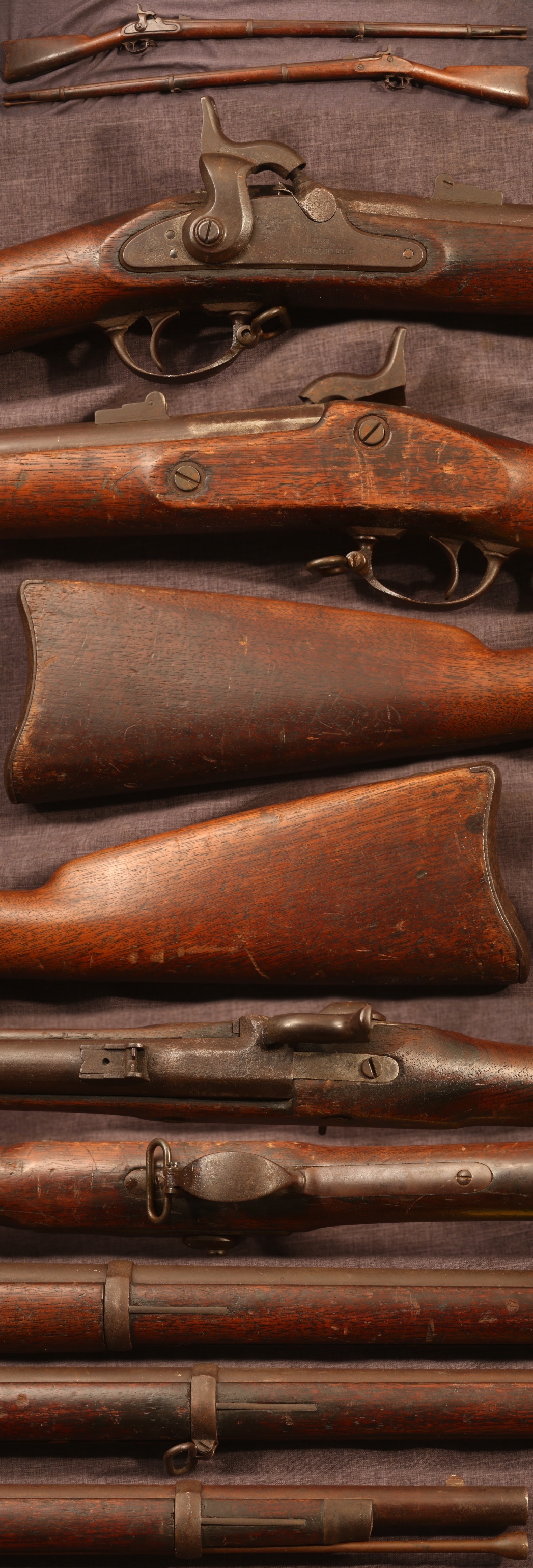 Springfield M1863 Type II musket dated 1864 on lock. Left side of barrel shows V, P, and Eagle proofs, left side of stock has faint ESA cartouche. Metal parts have a rust brown patina overall with some pitting in the barrel breech area. Stock has an overall smooth appearance with numerous minor handling marks, free of cracks, has some slivering in the ramrod channel and a piece of wood missing behind the hammer. Mechanically good, sold as a collector item only, not warranted safe to shoot.
