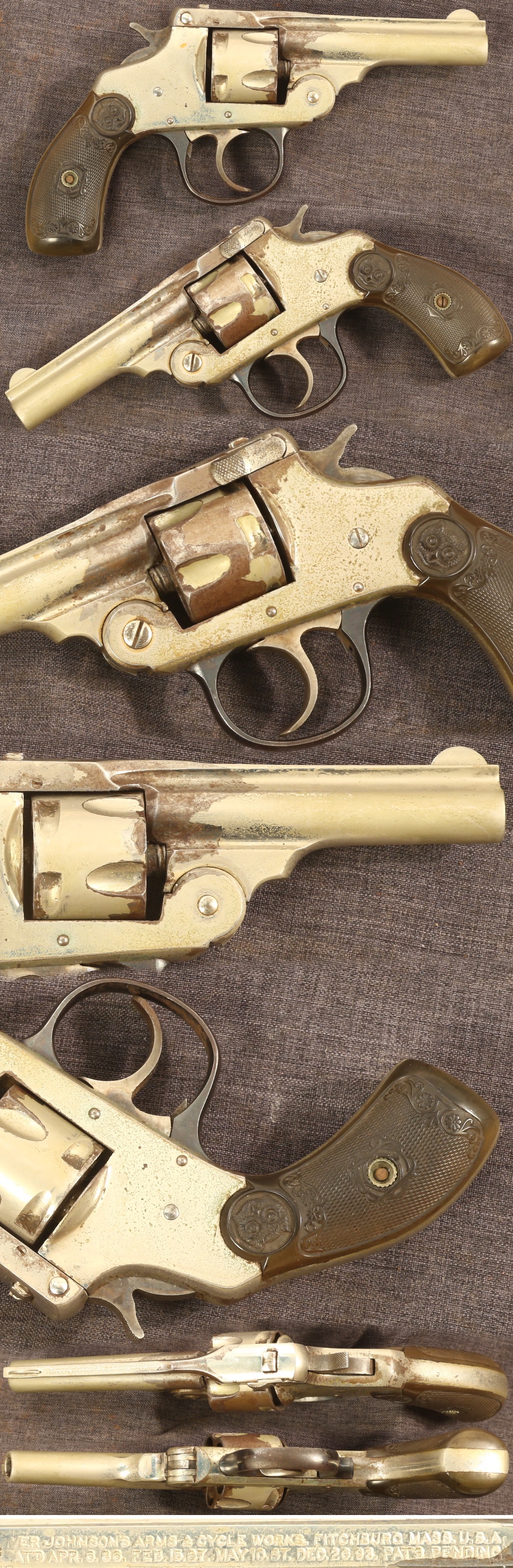 SOLD - Early Iver Johnson 32 caliber double action revolver with left side frame release. Serial number 47xxx. 3" barrel. Metal parts have much of the original nickel finish with large flakes absent on the cylinder and barrel, and rust freckling present on the frame. Hard rubber grips are fine, free of cracks and chips. Case colors present on trigger and hammer. Blued triggerguard. Mechanically good, sold as a collector item only, not warranted safe to shoot.