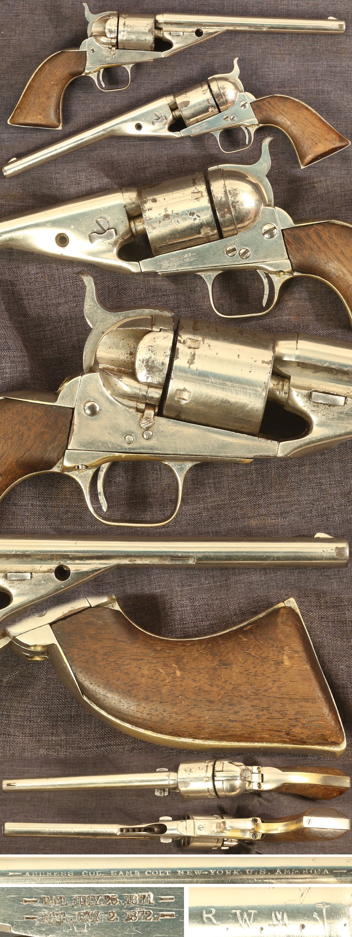 US Navy marked Colt .38 centerfire revolver. One of the series made in original cartridge configuration at the factory from perviously unused percussion parts. Serial number 2981 matching except unnumbered wedge. Marked "R.W.M. [anchor]" on underside of barrel. Extractor, housing, and loading lever plug are absent. Several screws are replacements. Very fine nickel finish overall showing some small missing spots, primarily on the cylinder. Grips have been sanded and show handling marks and edges of the butt worn down from the years. Mechanically good, sold as a collector item only, not warranted safe to shoot.