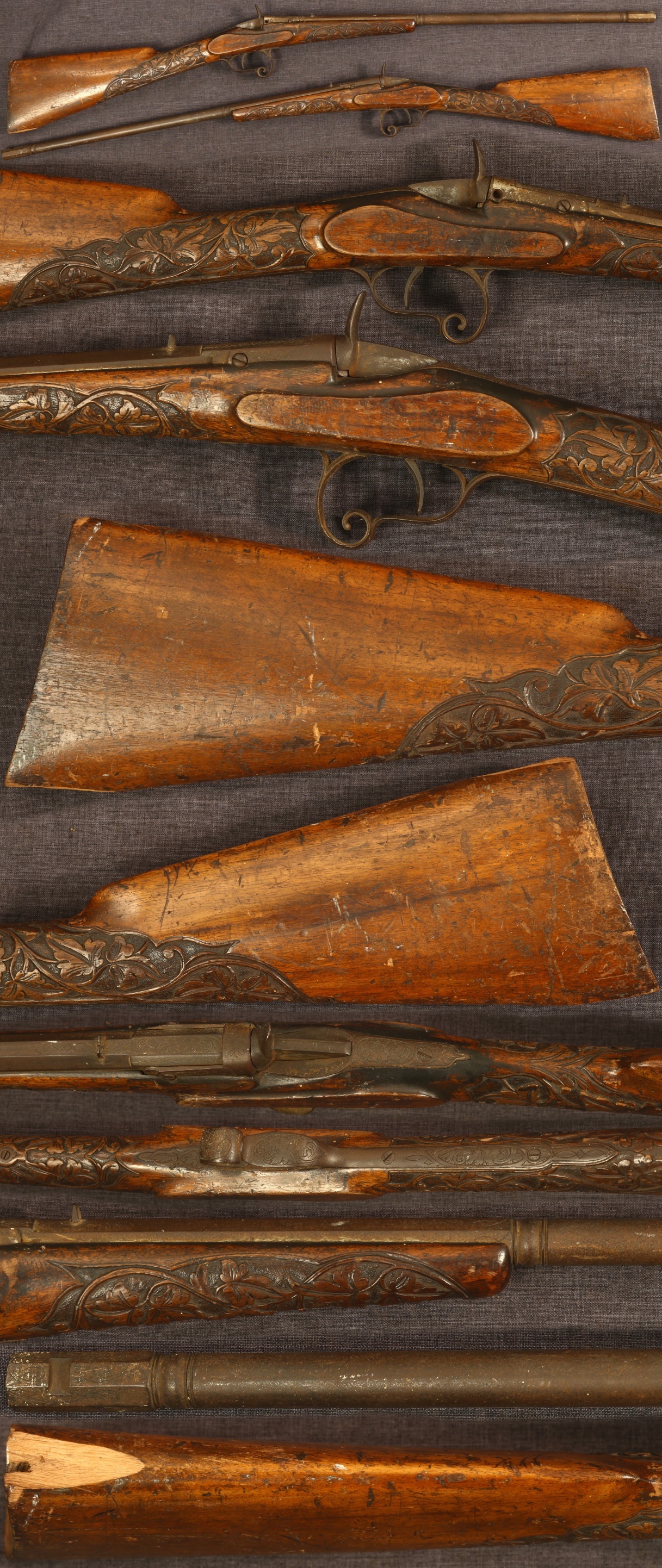 Fancy Flobert lifter block action rifle. 22" part octagon, part round barrel with "wedding band" separator. Bore of about 0.22" Metal parts are nicely engraved with a dark uncleaned patina. Buttplate, breechblock knob, and front sight are absent. Stock is intricately carved with a stippled background in the forearm and wrist. Wood shows numerous light marks and scratches to the finish, and a piece missing from toe and heel of butt. Hammer has spring tension but does not cock. Sold as a collector item only, not warranted safe to shoot.