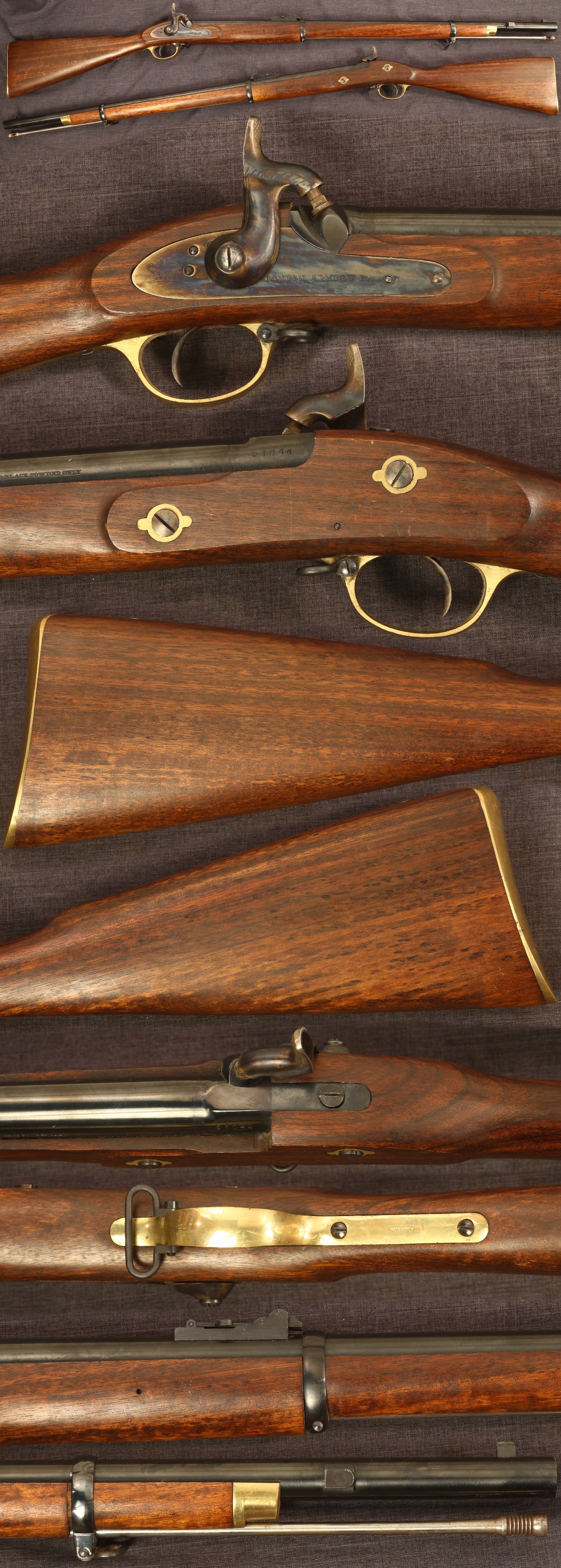 Euroarms P1856 2-band Enfield rifle. Marked on lock "LONDON ARMORY Co." Serial number 51044. Very fine finish on metal parts with a bright surfaces to the brass. Stock is sound and free of cracks with minimal scattered light handling marks. Mechanically good. We are not gunsmiths and do not warrant this gun to shoot safely. Please seek guidance from an expert in blackpowder gunsmithing if unsure about the safety and management of this rifle.