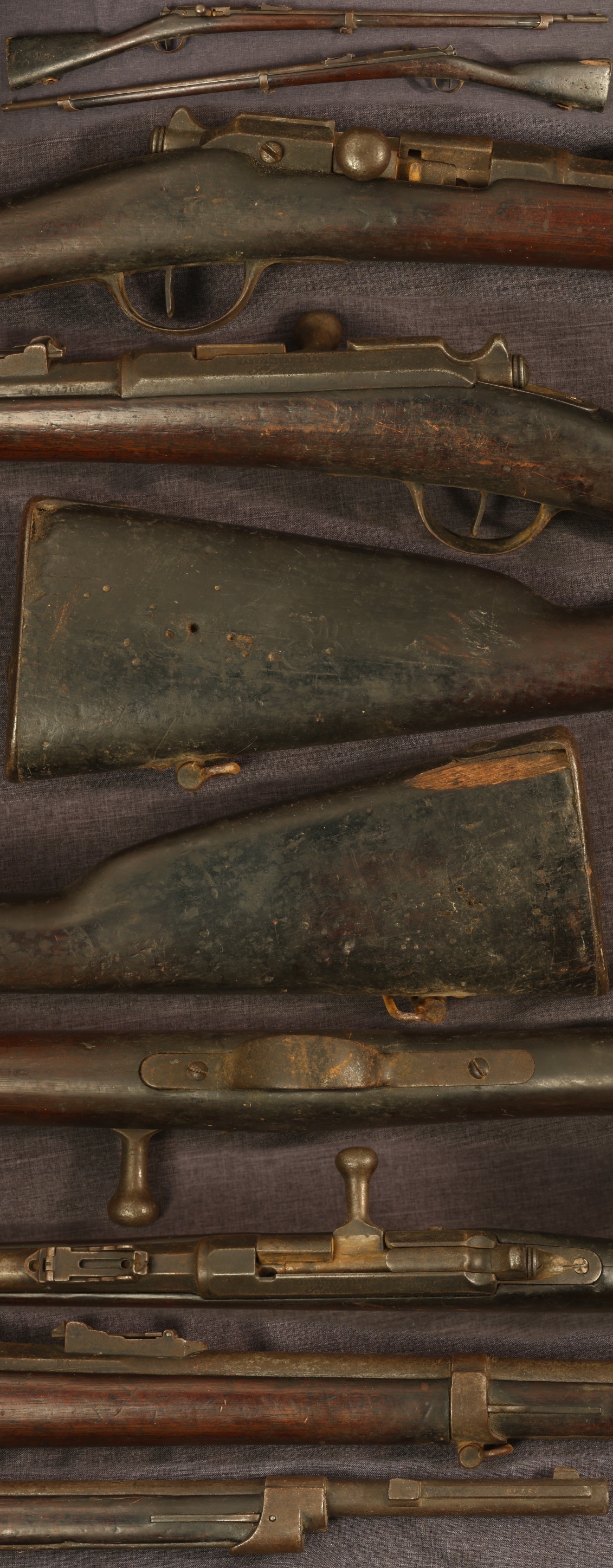 French M1874 Gras rifle by St. Etienne. Serial number 59700. 32-1/2" barrel. Gun is well-worn overall with a dark patina uncleaned on all metal parts. Cleaning rod is absent, as is the extractor and at least one piece of the bolt. Stock shows numerous handling marks and is also uncleaned. There is a piece of wood missing to left of barrel tang and some worn missing wood on right side at buttplate. Bolt still cocks but is loose. Sold as a collector item only, not warranted safe to shoot.