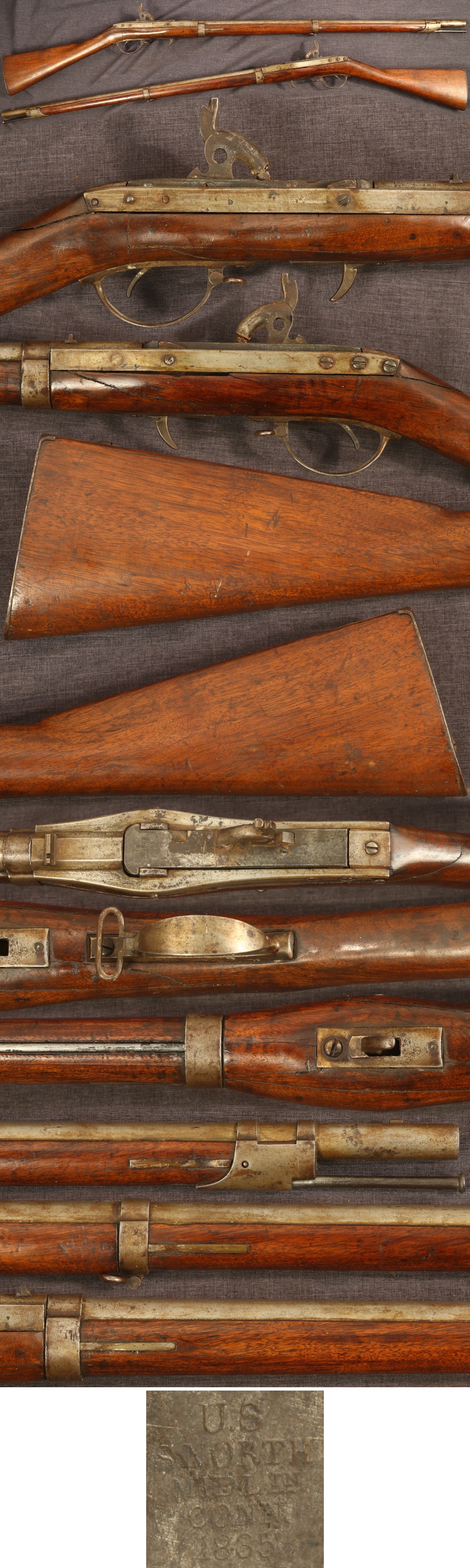 Confederate altered S.North M1819 Hall's Patent breechloading percussion rifle. An extensive study of Confederate altered Hall rifles is found in Chapter XXIII of "Confederate Rifles & Muskets" by Murphy & Madaus. Over 10,000 obsolete M1819 rifles found themselves in state and federal custody on the eve of the Civil War in the states that would become the Confederate States of America and while unpopular, the initial crush to put arms in the hands of men would create an interesting melange of conversions, including even a muzzle loading conversion of the breech loading rifle. This rifle, which preserves the structure of the original flintlock cock associated with western theatre conversions, even has the original spur, taken down slightly, with an effectively applied, but awkward in appearance percussion striking nose. The rearward portion of the triggerguard strap with the pistol grip provision was removed in a workmanlike manner and the mortise smoothed out. One example pictured in the study is depicted having had the pistol grip removed. Standard configuration otherwise. Well marked with date of 1835. Metal parts were cleaned at some point with a light gray coloration overall and some pitting present in the nipple area. Stock exhibits the "Hall crack" rear of action from firing recoil. Wood is well-worn with an added finish, has several cracks in the action area with a period replaced piece of wood along the left side of the action. Mechanically good, sold as a collector item only, not warranted safe to shoot.
