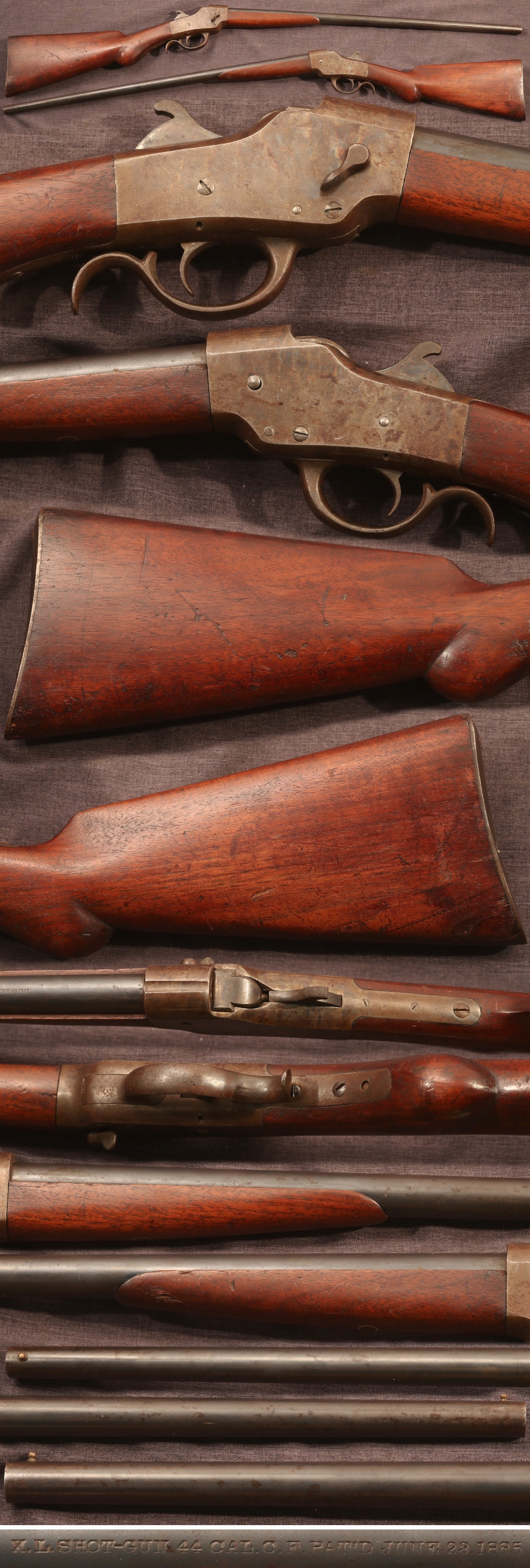 Hopkins & Allen 44 smoothbore falling block. Marked on top of barrel "X.L.SHOT-GUN 44 CAL.C.F.PAT'D JUNE 23.1885". Built like a Hopkins & Allen rifle. 24" round barrel with excellent original blue finish. Other metal parts with vibrant case colors mixing with light to medium patina. Stocks are very good with a small crack by the buttplate and some moderate marks from rough handling, has not been sanded or cleaned. Functional takedown feature. Mechanically good, sold as a collector item only, not warranted safe to shoot.