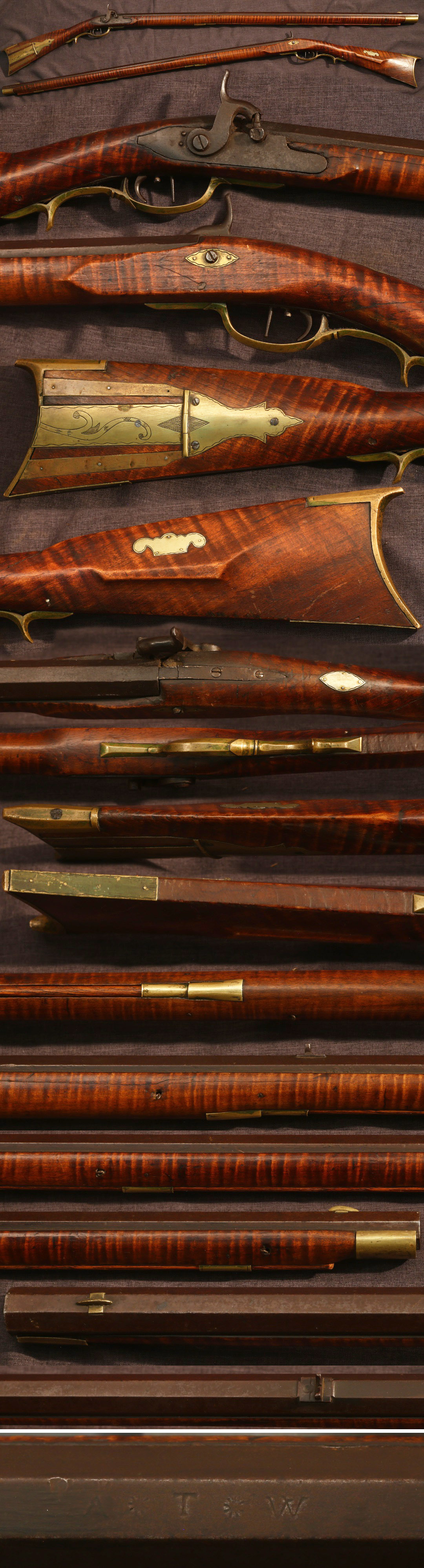 Fine C1840 percussion curly maple fullstock rifle. Signed on barrel "A * T * W". 35-3/4" octagon barrel with dot and starburst decoration on muzzle. About .32 caliber bore. Nice original sights. Brass parts have a light mustard patina, iron parts have a deep untouched smooth chocolate patina with a little expected pitting in the barrel breech area. Stock has a bold, tight flaming curly maple character virtually the entire area, has an old added finish that shows minor expected marks, a grain crack in the forearm edge in front of the lock, and a wrist crack that seems to have been repaired well and shows no play. Handmade lock with lockplate following the contours of a classic Bedford county lock. 33-3/4" plain ramrod could be original, and has patina from having been in the gun as photographed for a long time. Mechanically good with set triggers. Sold as a collector item only, not warranted safe to shoot.