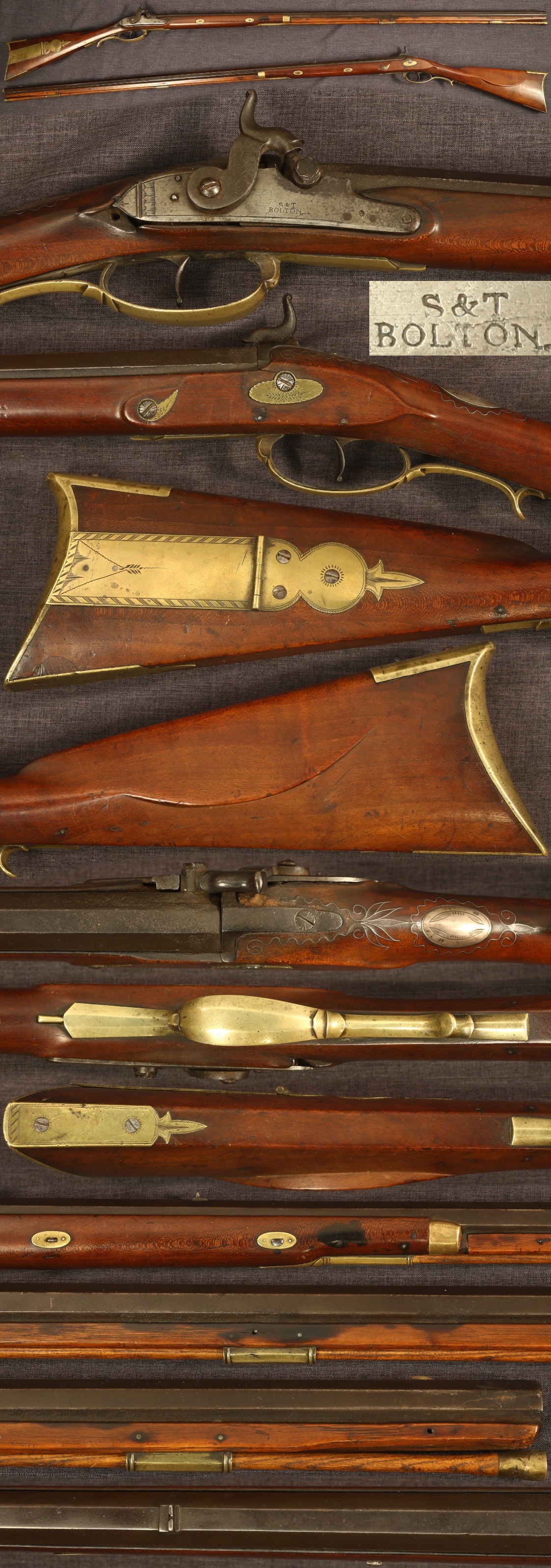 C1820-30 New England percussion halfstock longrifle. 42-3/4" octagon barrel of 7/8" width and 0.51" bore. Marked on lock "S&T BOLTON". Classic New England features including "teat" at front of triggerguard, shape of patchbox, style of engraving, and wrist inlay/escutcheon. Nicely engraved brass furnishings including a stylized "tipi" shape on the patchbox. Domed silver escutcheon in wrist surrounded by wire inlay and wire inlay around barrel tang. Barrel and lock have a smooth patina, brass parts have an attractive light coloration, probably having been cleaned at some point. Stock is made of a nice quality cherry, showing average wear and handling, has a small crack by the rear lock bolt and a chip with associated crack under rear of lock. Patchbox latch doesn't have spring tension. Lock is mechanically good, sold as a collector item only, not warranted safe to shoot.