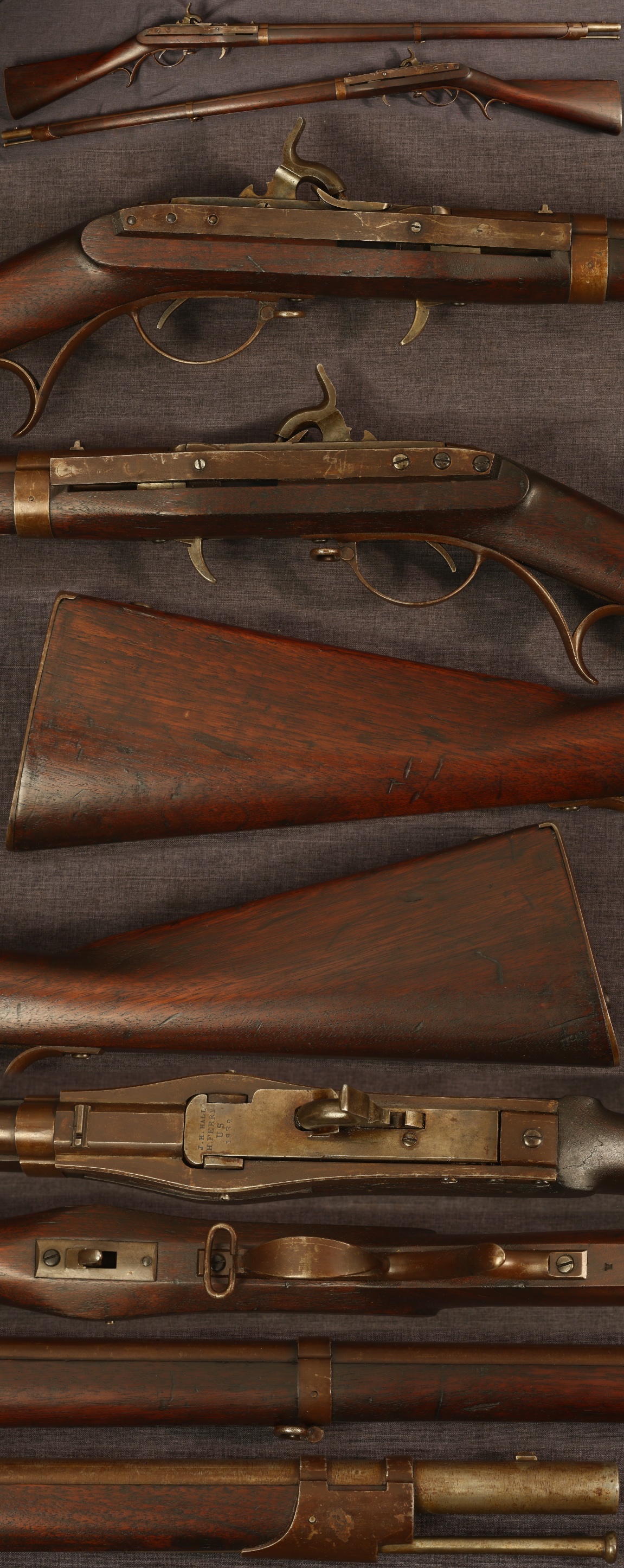 M1819 US Harpers Ferry Hall breechloading percussion conversion rifle, dated 1832. Standard configuration with very fine original brown finish on metal parts. Stock shows little wear and use, having sharp edges and a raised grain character. Inspector initial deeply sunken behind the trigger guard. There is a small crack in the typical location behind the action due to recoil, and a few moderate handling marks. Mechanically good, sold as a collector item only, not warranted safe to shoot.