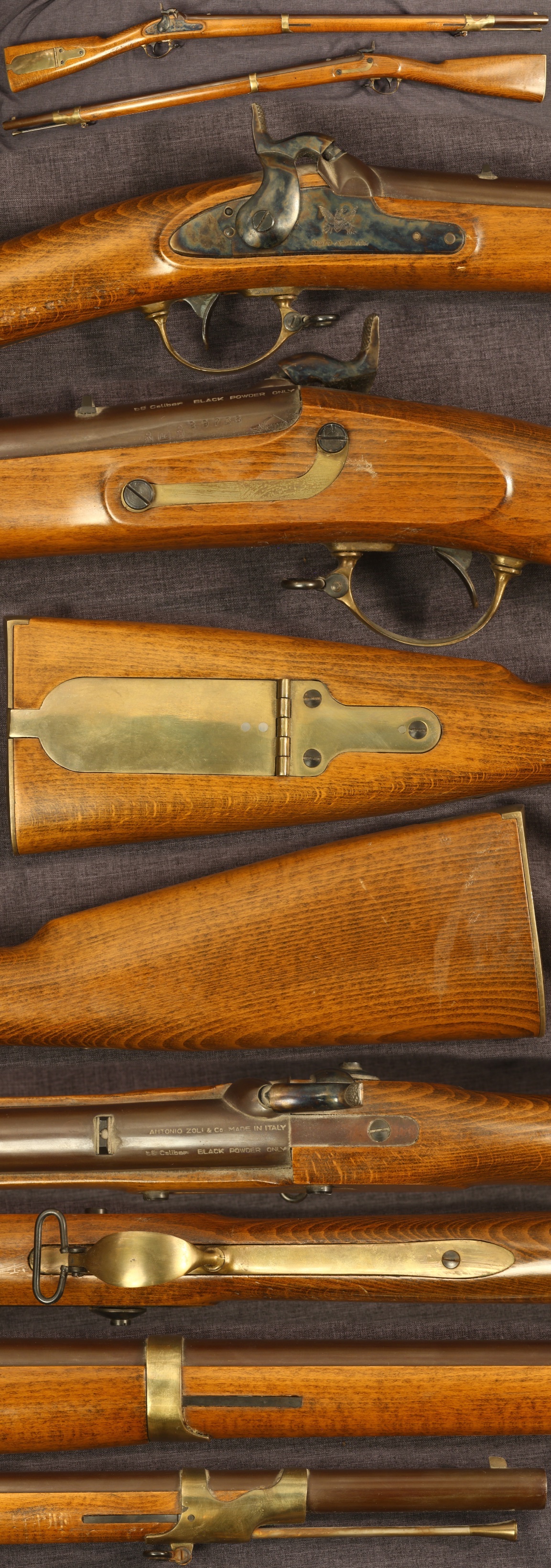 Antonio Zoli/Navy Arms M1841 Mississippi rifle .58 caliber blackpowder replica. Serial number 29736. Metal parts have fine brown finish on barrel, case colored lock, and light patina to brass parts. Stock has scattered scratches with a more substantial concentrated patch of scratches in the right side of the wrist and some dings in the right side of the forearm behind the upper band. Mechanically good. We are not gunsmiths and do not warrant this gun to shoot safely. Please seek guidance from an expert in blackpowder gunsmithing if unsure about the safety and management of this rifle.
