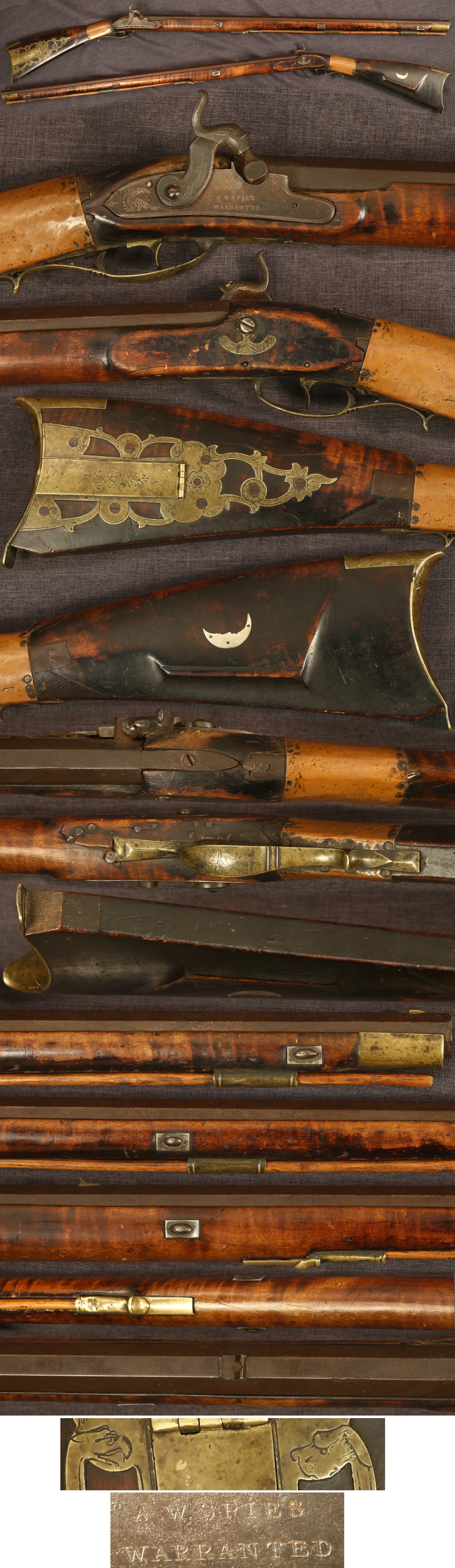 C1840-60 curly maple fullstock percussion rifle. 33" octagon barrel of 15/16" width and 0.45" bore. Marked on lock "A.W.SPIES/WARRANTED". Spies was a New York dealer whose business continued after his death until 1877. Nice cutout and floral engraved patchbox with integrated eagle and dog heads. Interesting repairs to wrist shows iron plates inlet into each side and then a sheet of brass nailed on top. Silver barrel key escutcheons, one of six is absent. Silver crescent moon inlay in cheek piece. Stock is well worn, having a crack by the lock screw, piece of wood missing above lock and at toe of butt. The wrist break is still loose in spite of the repairs. Patchbox contains some patches and three lead round balls. Mechanically good, sold as a collector item only, not warranted safe to shoot.