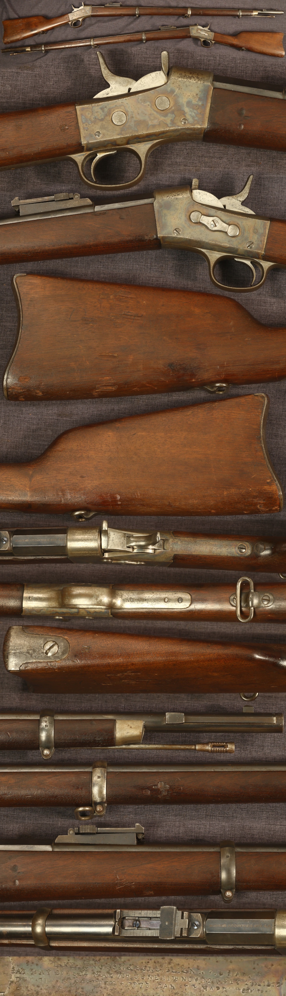 Remington M1879 Argentine rolling block military rifle. Highly unusual to find in the original blue with color casehardened frame, virtually all of them seem to have been refurbished in blue. 36" round barrel with octagon breech. .43 caliber. Adapted for sabre bayonet. Finely stamped Remington three line marking on frame tang. Barrel has very fine original blue and receiver has vivid color casehardening with areas of gray and some speckles of light patina. Other metal parts are a light gray patina. Stock is very good, has a deeply sunken inspector mark on right side of wrist and in front of buttplate tang. Wood is very good, showing several moderate handling marks scattered, and a round mark behind the upper frame tang that looks like a dowel could be in it, but no apparent crack. Mechanically good, sold as a collector item only, not warranted safe to shoot.
