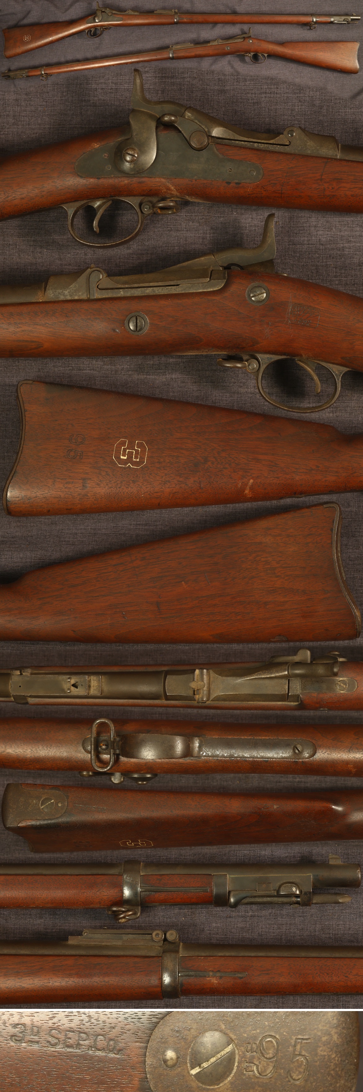 NY unit marked M1888 Springfield .45-70 "trapdoor" rifle with rod bayonet. Serial number 548852. Marked in heel of buttstock "3D SEP.Co.", "95" in tang of buttplate, "3" and "95" in right side of butt, for the 95th rifle of the Third Separate Company of the New York National Guard. Metal parts have an overall untouched dark matte patina. Stock is smooth with some wear and use, showing some minor handling marks and scratches with one ding in the bottom of the left side of the butt, free of cracks and chips. Sunken inspector cartouche opposite lock with date of 1892. Mechanically good, sold as a collector item only, not warranted safe to shoot.