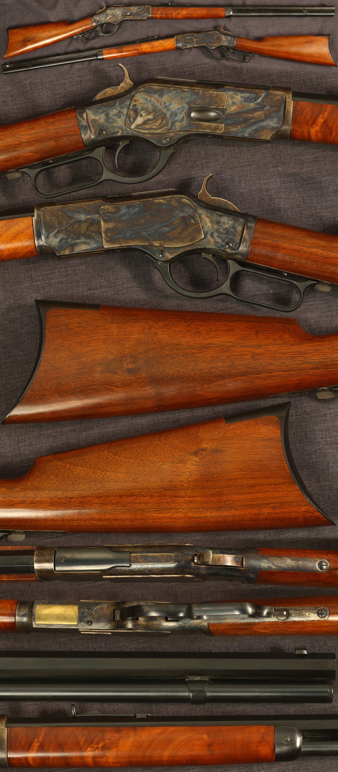 Uberti replica M1873 Winchester lever action rifle in 44 WCF caliber. Serial number 67170. 24" octagon barrel. Handsomely finished with color casehardened frame and other parts blued. Metal parts appear to be in 100% finish. Stocks are excellent+ with few very minor handling marks and some fine swirl scratches to the butt, visible in bright light, probably from the making. Ships to FFL dealer. Mechanically good, not warranted safe to shoot, buyer should consult a professionally trained gunsmith if considering shooting this rifle.