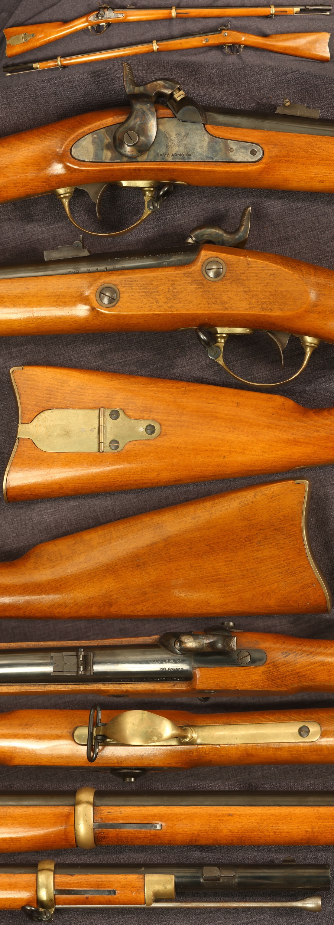 Antonio Zoli/Navy Arms M1863 Zouave rifle .58 caliber blackpowder replica. Serial number 21130. Metal parts have fine blue finish on barrel, case colored lock, and light patina to brass parts. Stock has scattered minor marks from handling. Mechanically good. We are not gunsmiths and do not warrant this gun to shoot safely. Please seek guidance from an expert in blackpowder gunsmithing if unsure about the safety and management of this rifle.