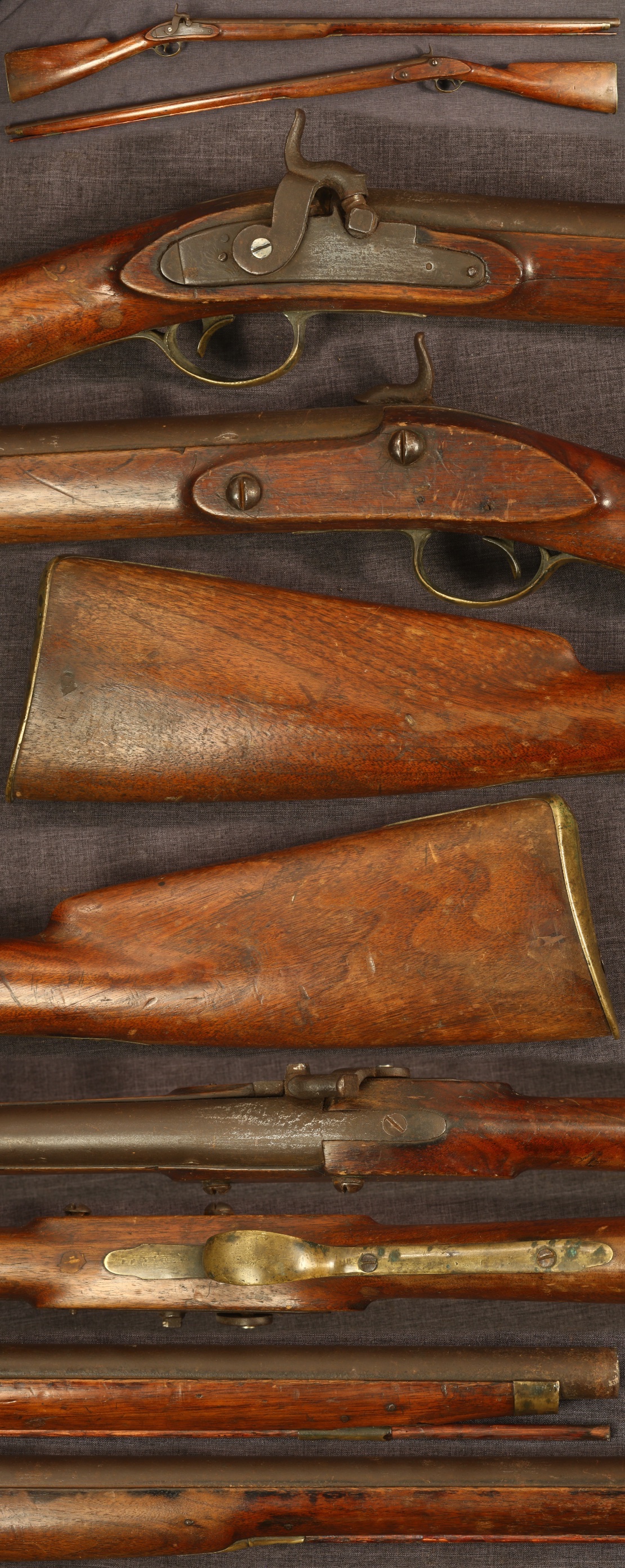 C1820-40 New England percussion fowling piece. Faint lock marking "LANE & READ/BOSTON" with Boston being stronger. 36-1/2" round barrel of 0.68" bore. Metal parts have a medium to dark patina overall with some expected pitting in the breech area and lockplate. Walnut fullstock has an old applied finish, faint hairline to wrist, crack in forearm from front of lock, and a chip on each side of the front ramrod pipe. Ramrod fills the channel for display but is too short to be functional. Mechanically good, sold as a collector item only, not warranted safe to shoot.